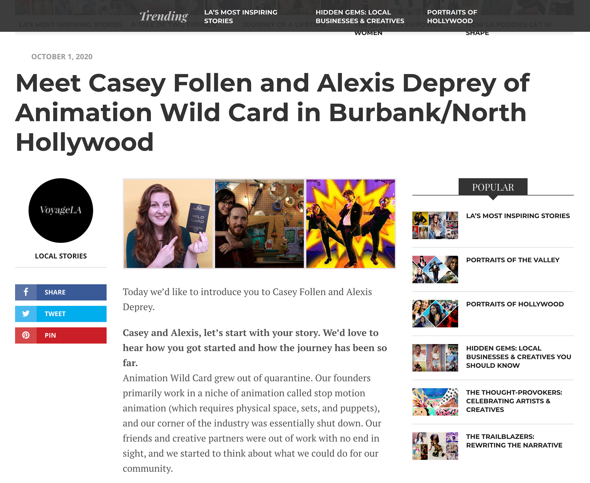 Voyage LA's mission is to build a platform that fosters collaboration and support for small businesses, independent artists and entrepreneurs, local institutions and those that make our city interesting. As part of their local stories series, Voyage LA interviewed AWC founders, Casey Follen and Alexis Deprey, about Animation Wild Card's journey.